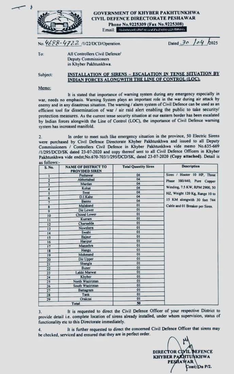खैबर पख्तूनख्वा सरकार के नागरिक सुरक्षा विभाग ने सभी डिप्टी कमिश्नरों और सिविल डिफेंस अधिकारियों को निर्देश दिया है कि वे आपातकालीन चेतावनी के लिए इन सायरनों को तुरंत लगवाकर रिपोर्ट भेजें. आदेश के मुताबिक पेशावर, एबटाबाद, मर्दान, कोहाट, स्वात, डेरा इस्माइल खान और बन्नू जैसे बड़े शहरो में चार-चार सायरन लगाए जाएंगे और बाकी के 22 जिलों में एक-एक सायरन लगाया जा रहा है, जिसमें लोअर दीर, चितराल, कुर्रम, नौशेरा, हरिपुर, बाजौर, हंगू, वज़ीरिस्तान, ओरकजई जैसे इलाके शामिल हैं.