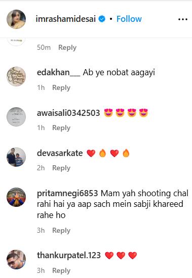 एक यूजर ने लिखा- अब ये नौबत आ गई है.  वहीं एक यूजर ने लिखा कि मैम ये शूटिंग चल रही है या आप सच में सब्जी खरीद रहो हो. वहीं कुछ लोग बोल रहे हैं रश्मि ऐसे सब्जी बेचते हुए खूबसूरत लग रही हैं. एक यूजर ने तो सब्जी के भाव भी पूछे. बता दें कि रश्मि की ये फोटोज उनके एक फोटोशूट का हिस्सा हैं.